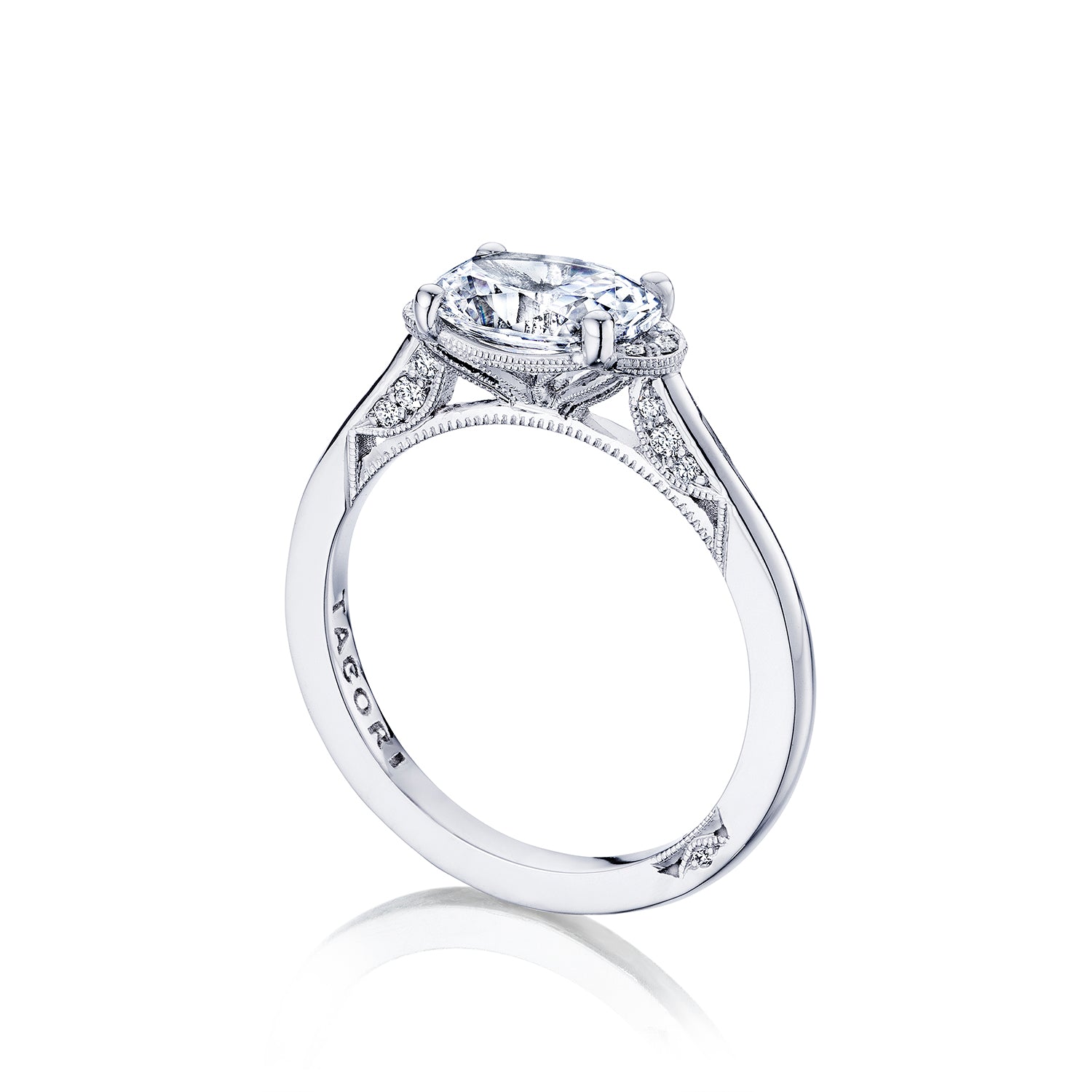 Accentuated by a diamond tipped frame that spotlights the elongated elegance of your oval center, this new Tacori style can be worn as a contemporary engagement ring or worn as a fashionable stacking right hand ring.