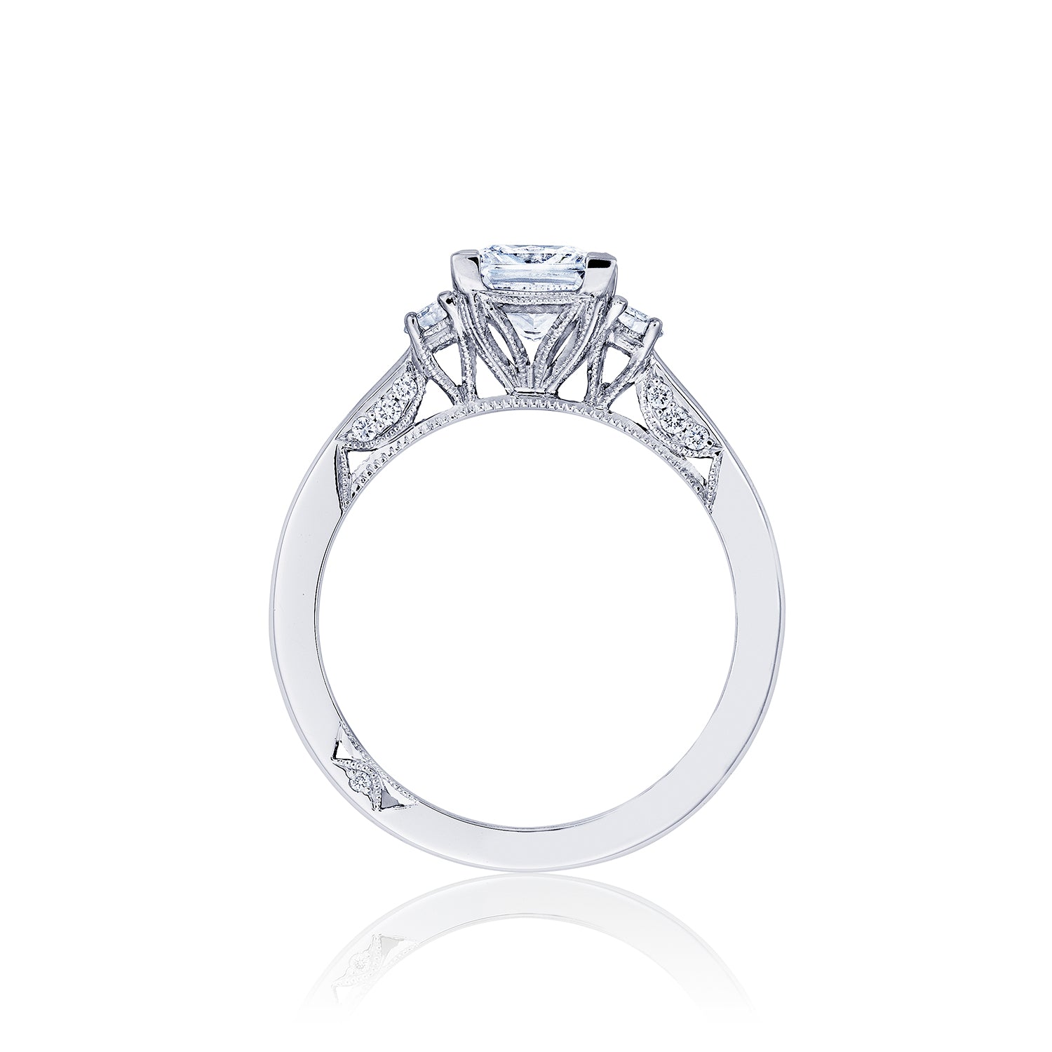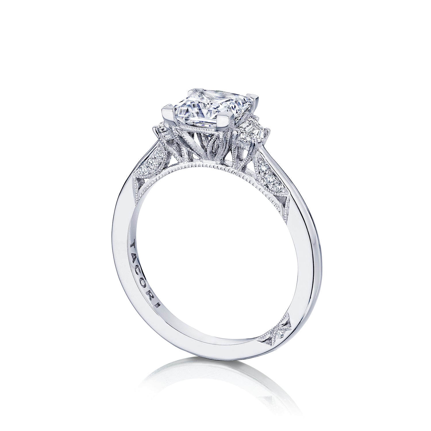 Simply stunning, simply Tacori. A traditionally elegant picture-frame prong outlines your princess center, which is further brought to life by two high-intensity cadillac side stones on a high polished band.