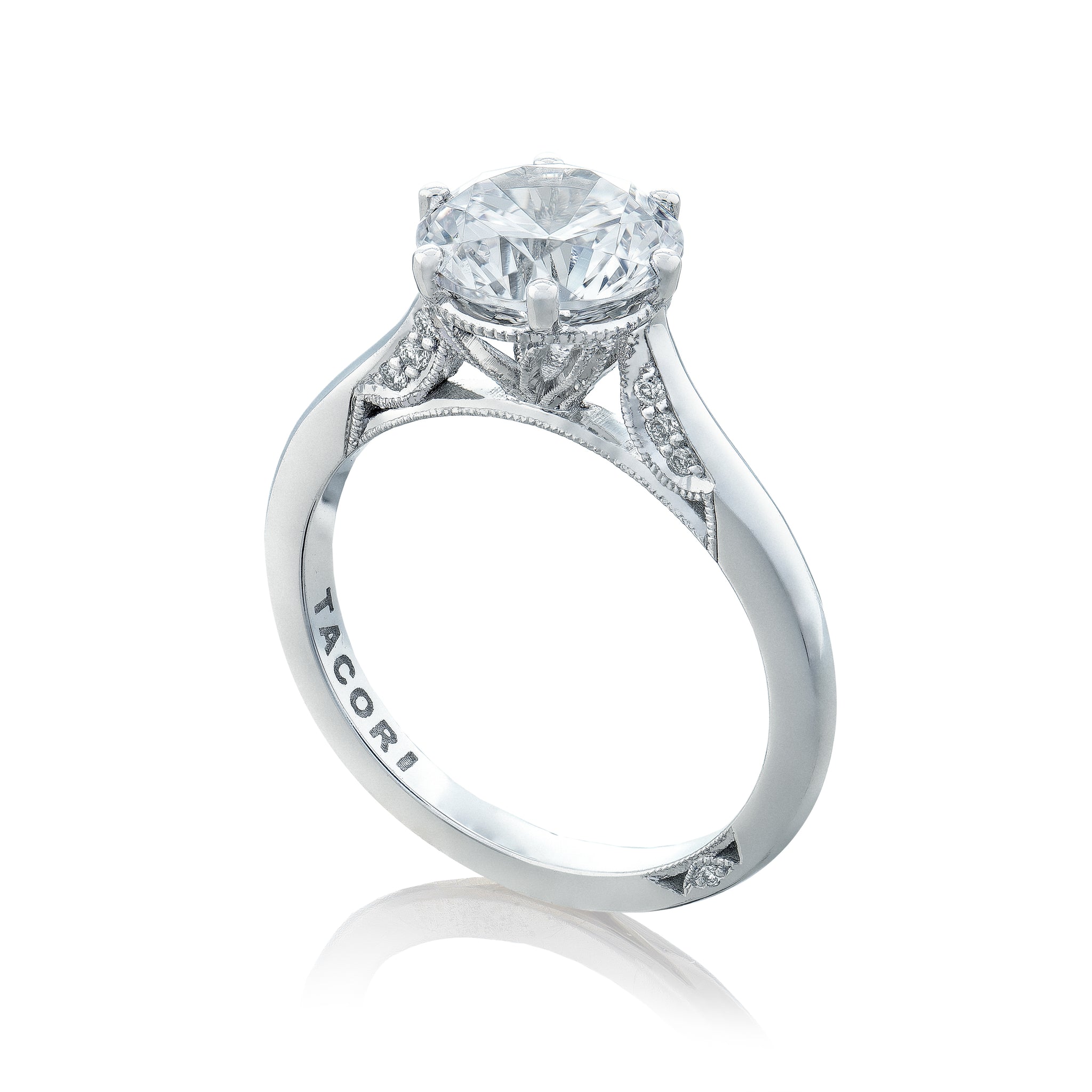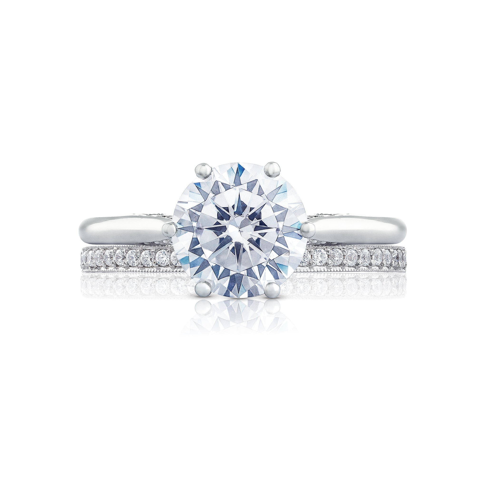 Let your brilliant round center shine in this timeless engagement ring. A sleek high polished ring with hidden diamond details along the inner face brings your round center to life.